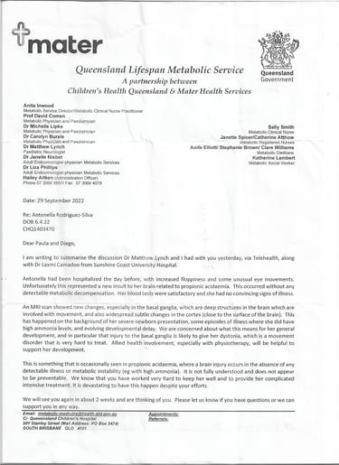 Antonella was born on the 06 April 2022. At three days old, she was critically unwell, she was unresponsive, cold, floppy, had abnormal breathing, and was rushed through to the Queensland Children Hospital PICU, where she required intubation, ventilation and haemofiltration. Within 12 hours she was diagnosed with a rare metabolic condition called propionic acidemia. Antonella spent the first 26 days of her life in hospital in critical condition.